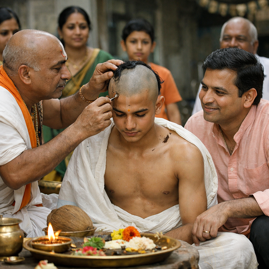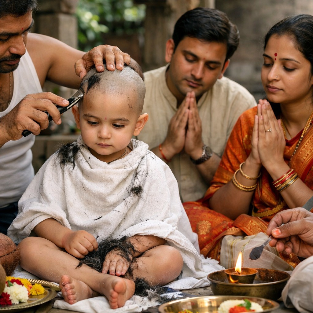 Mundan Sanskar involves shaving the child’s head for the first time. According to tradition, it removes impurities from past births and promotes healthy hair growth.