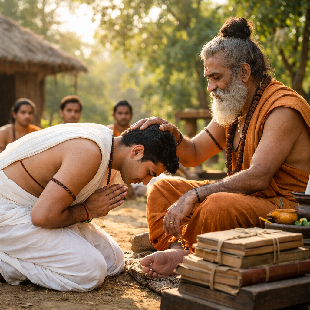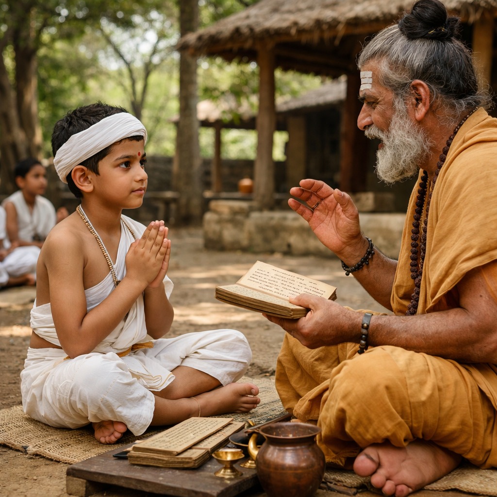 The child receives the sacred thread and is taught the Gayatri Mantra, beginning the journey of spiritual learning.