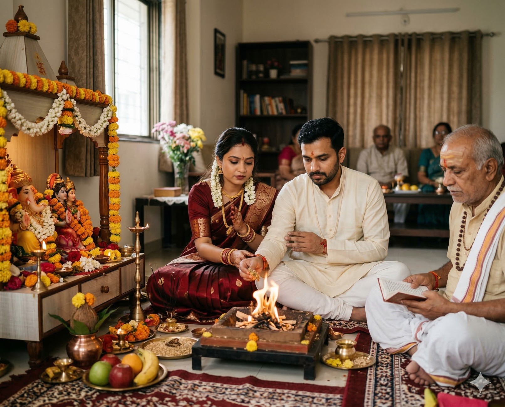 A priest performs a Vedic Havan (fire ritual) while chanting mantras. The couple prays for a healthy, wise, and virtuous child.
