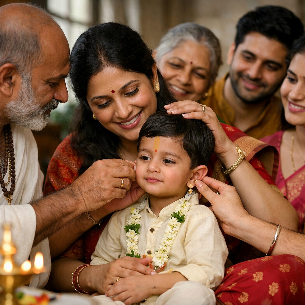 The child’s head is shaved and prayers are offered for health, protection, and long life.